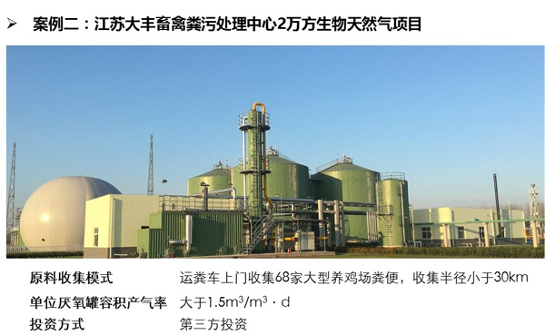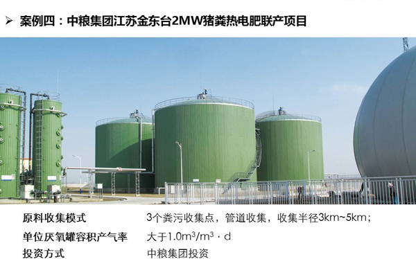 大型集中式畜禽養(yǎng)殖廢棄物處理模式主要有三大特點:一是糞污統(tǒng)一收集、集中處理;二是,第三方專業(yè)公司加入的商業(yè)化模式;三是全產(chǎn)業(yè)鏈統(tǒng)籌推進。通過“專業(yè)的人做專業(yè)的事”,整合多種技術(shù)模式,實現(xiàn)產(chǎn)品多元化利用,使沼氣工程中物質(zhì)流、能量流及利益流合理健康運轉(zhuǎn),沼氣工程本身具備造血功能,并能進行商業(yè)化復(fù)制。壽總報告中以山東民和日產(chǎn)100,000m3雞糞沼氣項目、江蘇大豐畜禽糞污處理中心20,000m3生物天然氣項目、新疆呼圖壁中廣核36,600m3沼氣提純項目、中糧集團江蘇金東臺2MW豬糞熱電肥聯(lián)產(chǎn)項目4個項目為例,從原料收集、沼氣高值利用、沼肥高值利用、經(jīng)濟效益等方面闡明了大型集中式畜禽養(yǎng)殖廢棄物處理模式的運行機制和技 術(shù)優(yōu)勢,這些成功案例表明該模式技術(shù)可行、可復(fù)制、易推廣,有效促進區(qū)域內(nèi)畜禽養(yǎng)殖廢棄物資源化利用。