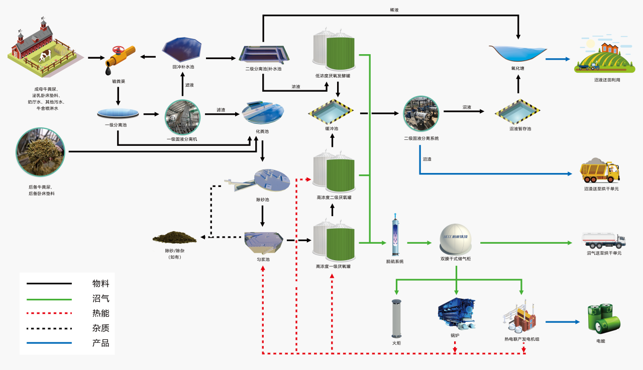 牧場沼氣項(xiàng)目通常以沼氣工程為樞紐,采用畜禽糞污水解除砂、厭氧發(fā)酵、高效節(jié)能攪拌機(jī)設(shè)備、沼氣能源化高效利用、沼渣墊料再生循環(huán)利用等多項(xiàng)核心工藝技術(shù)和關(guān)鍵設(shè)備,有效解決牧場糞污治理環(huán)保問題的同時(shí)實(shí)現(xiàn)甲烷減排,助力牧場積極踐行“雙碳”行動(dòng),實(shí)現(xiàn)牛糞污減污降碳。杭能環(huán)境幾十年如一日在有機(jī)廢棄物資源化領(lǐng)域不斷深耕,不斷創(chuàng)新,為推動(dòng)牧業(yè)養(yǎng)殖高質(zhì)量、節(jié)能綠色發(fā)展貢獻(xiàn)力量。